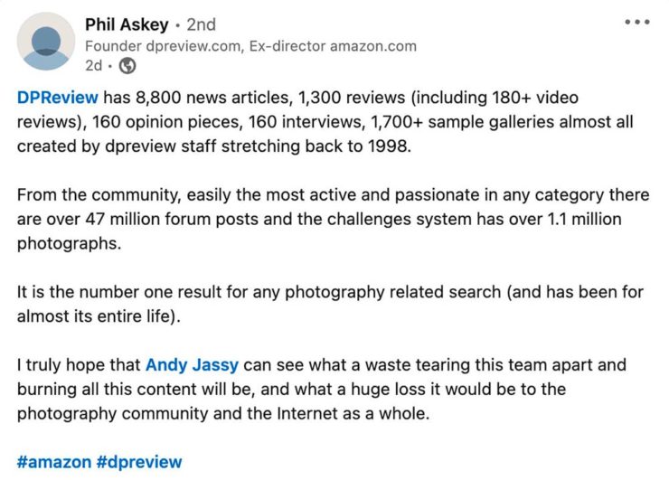 Digital Photography Review, long known as just DPReview, is being shut down. Started in 1998 by Phil Askey, it’s currently part of Amazon and is arguably the internet’s leading camera database — with over a thousand reviews of cameras, lenses, and related items, 24,000 articles, some 2.7 million comments, and more.