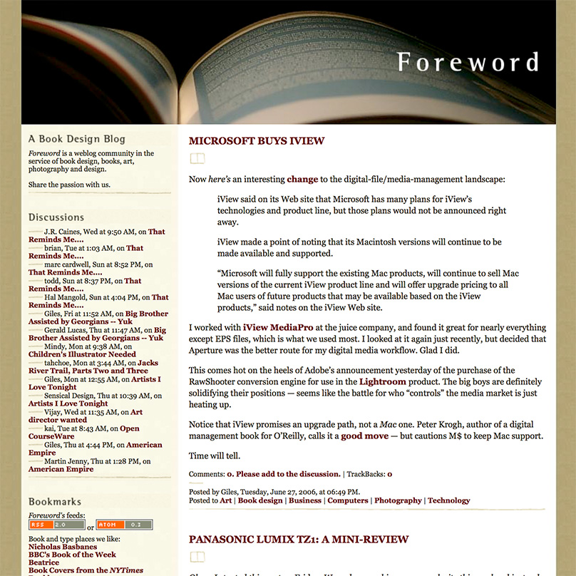 I’ve been seriously regretting losing Foreword for a while now — and its return one of the driving reasons for the new web site. Part of that has to do with a return to book design, and wanting to comment on the same, but also because I don’t do social media and have wanted a space to talk about — and get feedback on — items to do with book design, photography, and so much more. There’s no place better than your own web site. Thus, Foreword is back, this time as part of my personal site: gileshoover.com.